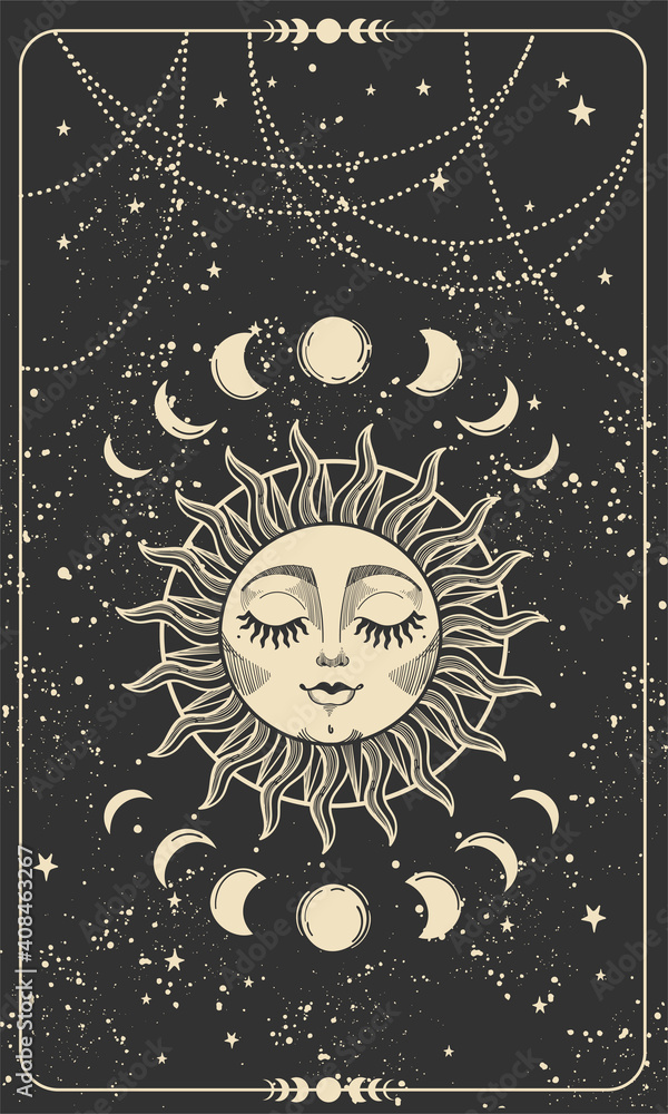 Tarot Card With Sun With Face Moon Phases And Stars Magic Card Bohemian Design Tattoo Engraving Witch Cover Golden Mystical Hand Drawing On A Black Background Stock Vector Adobe Stock